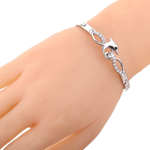 Bracelets Type: Dolphin BanglesDiameter: 2.2inchStyle: TrendyGender: WomenSetting Type: Tension SettingMaterial: CrystalPlating: Silver PlatedShape\pattern: Round