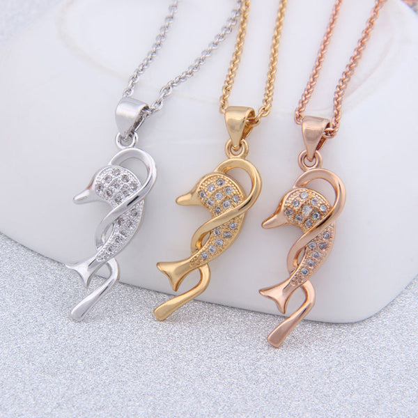 Item Type: Dolphin Necklaces Shape\pattern: Dolphin Material: Cubic Zircon Chain Type: Link Chain Colors: Gold, Silver, Rose Gold Pendant Size: 1 cm x 2.5 cm Length: 39 cm + 3.2 cm
