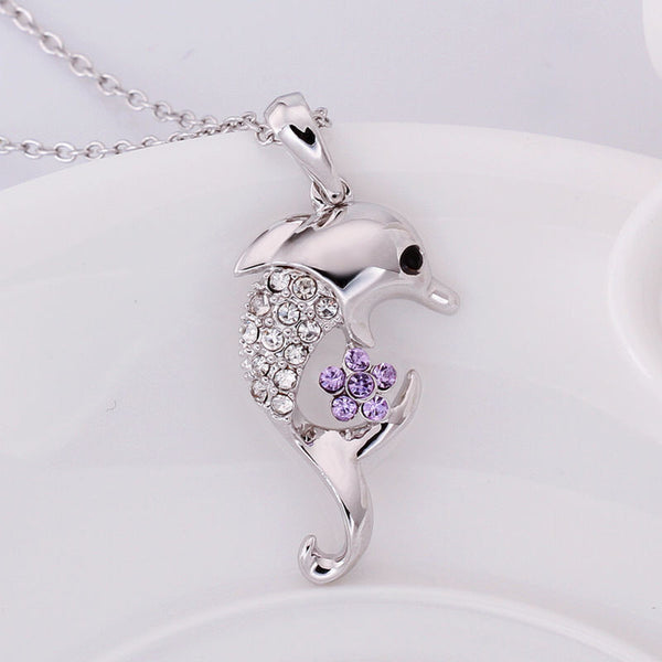 Item Type: Dolphin NecklaceMaterial: Cubic ZirconChain Type: Link ChainShape\Pattern: DolphinMetal: White Gold Plated Pendant Size: 37 mm x 17 mmLength: 450 mm