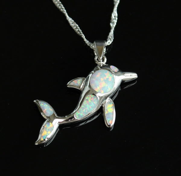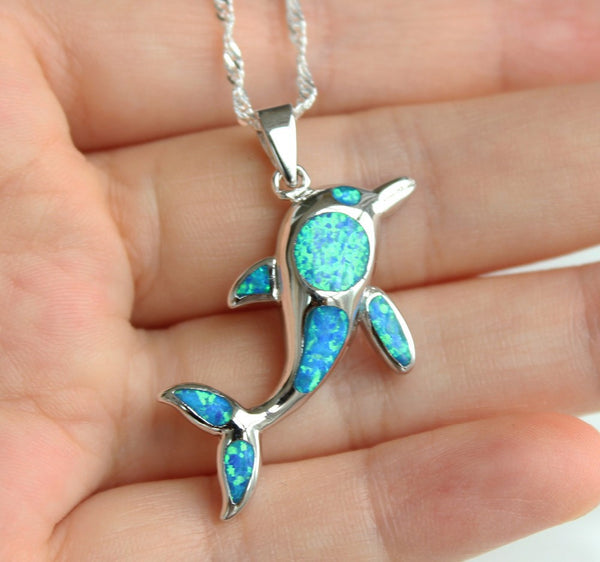 Cute Blue Fire Opal Jumping Dolphin Pendant Necklace